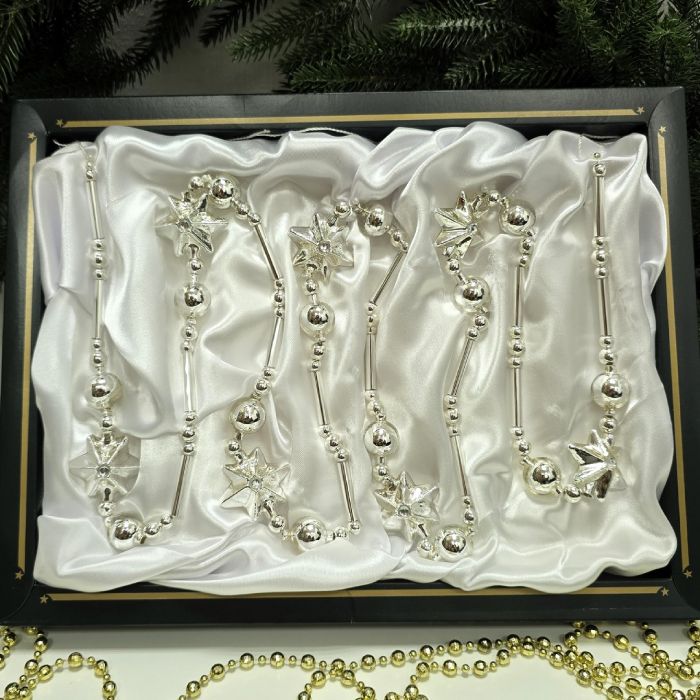 Бусы выполнены из стекла, что придает им особую изысканность и блеск. Серебристый цвет бус создает ощущение морозного зимнего вечера, а их длина в 170-180 см позволяет украсить даже большую елку.