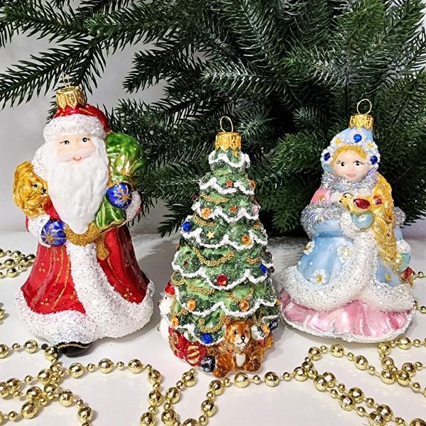 В наборе вы найдёте три изящные игрушки: Снегурочка, Дед Мороз и ёлочка, выполненные вручную из высококачественного стекла. Эти игрушки отличаются красотой и яркостью, что делает их идеальным выбором для создания праздничного настроения.