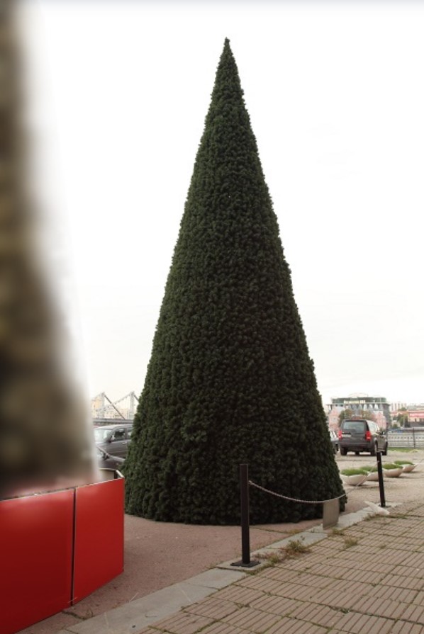 Для того чтобы обезопасить ель от падения при установке на улице, её основе придан вид металлического конусовидного каркаса, который представляет собой окружности разного диаметра, соединенные поперечными ребрами жесткости.