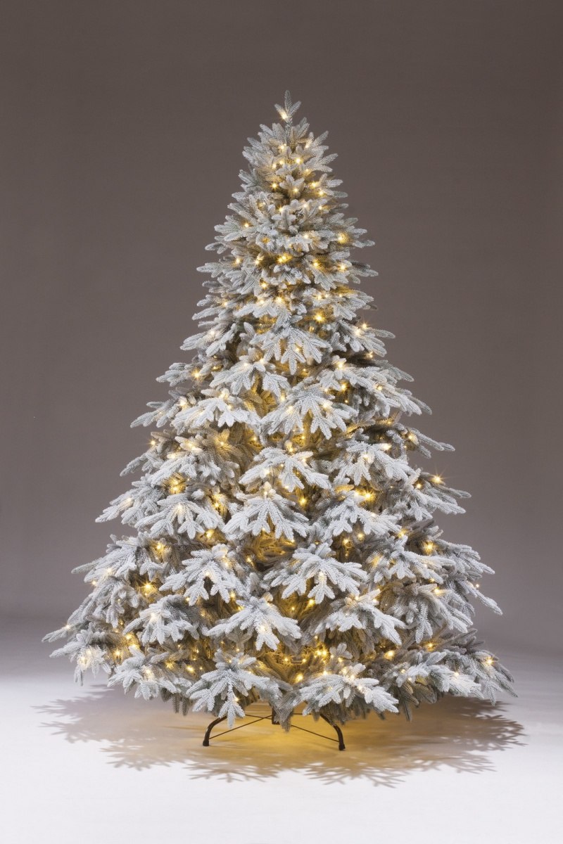 Искусственная ель серии «Престиж заснеженная с освещением» выглядит особенно нарядно и празднично благодаря ветвям, густо покрытым белым искусственным снегом. Причем это не краска, а фактурное покрытие – полная имитация натуральных снежинок. Хвойные лапы опущены вниз, общий вид ёлки очень похож на натуральное дерево под снегом.