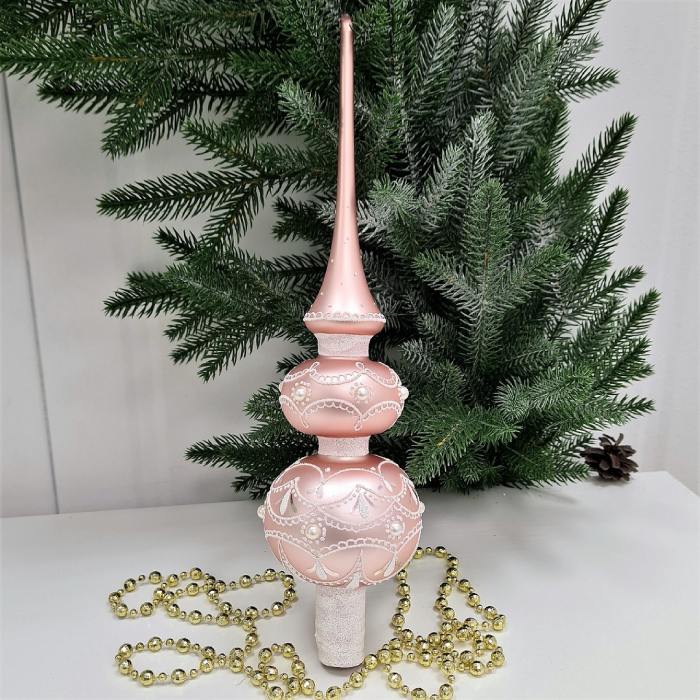 Стеклянная верхушка на ёлку в розовом цвете с серебристыми вензелями - символ праздника и волшебства. Она станет ярким акцентом на вашей елке и добавит в атмосферу новогоднего настроения. Ручная роспись делает каждую фигурку уникальной и неповторимой.