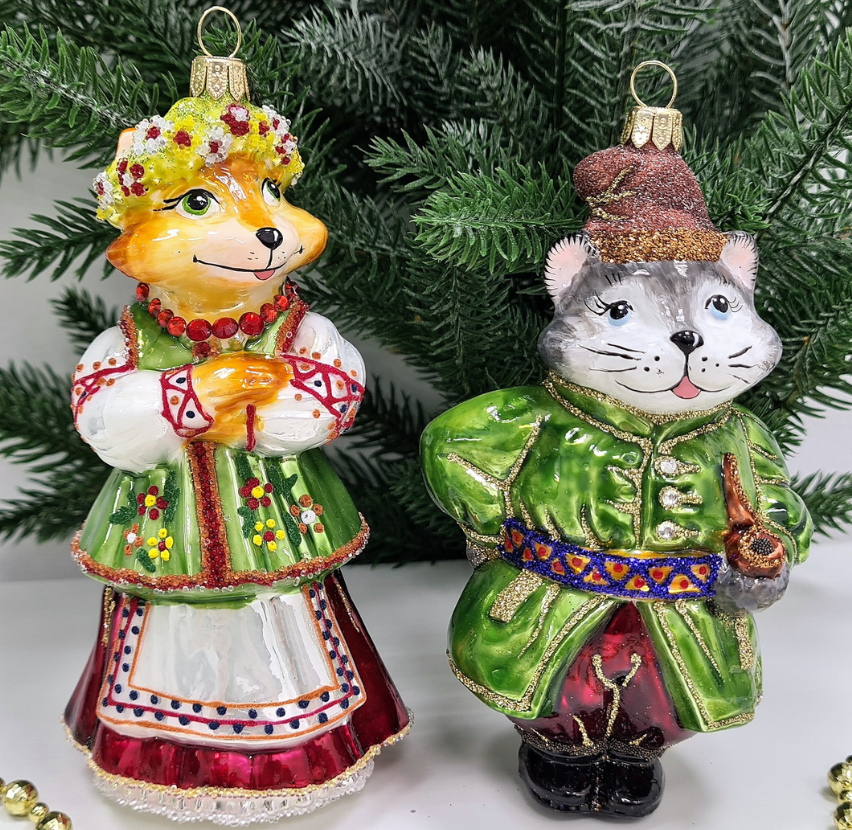 Набор включает в себя две стеклянные ёлочные игрушки: лису в цветочном венке и кота. Размеры игрушек составляют 14,5х8х7,5 см для лисы и 13,5х8х6,5 см для кота.
