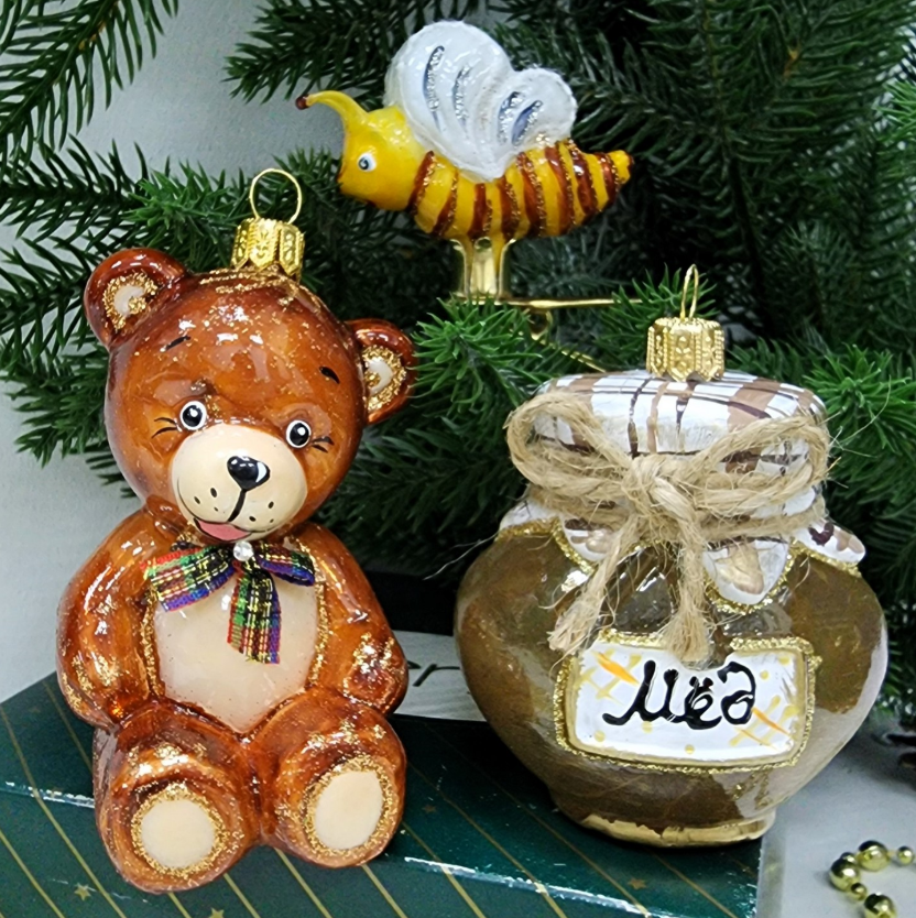 В комплекте вы получаете три стеклянные ёлочные игрушки: Мишка, Пчелка и Баночка. Мишка - 10х5,5х5,5см