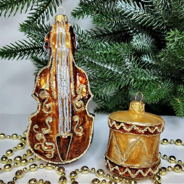 Набор стеклянных ёлочных игрушек Irena-Co "Контрабас и Барабан" – это уникальное украшение для вашей новогодней ёлки. В комплекте две игрушки: контрабас (13,5х6х3,5 см) и барабан (5,5х5х5 см).