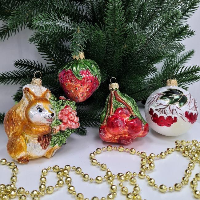 Среди них вы найдёте фигурку белки с веткой рябины, шарик с изображением клубники, гроздь вишни и обычный шар. Все эти игрушки непременно создадут атмосферу праздника и добавят в дом атмосферу волшебства.