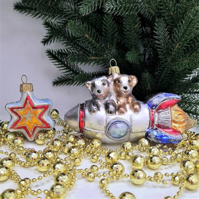 Каждая игрушка весит 167 грамм, что гарантирует их прочность и долговечность. Выберите набор стеклянных ёлочных игрушек Irena-Co «Белка и Стрелка на ракете», чтобы ваша новогодняя ёлка стала поистине незабываемой.