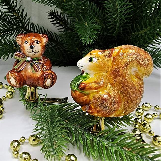 Эти изящные стеклянные фигурки украшены ручной росписью, что придает им индивидуальность и теплоту. Белочка с жёлудем (5х5х3,5 см) и мишка на прищепке (7х7х7 см) весят 167 и 150 грамм соответственно.
