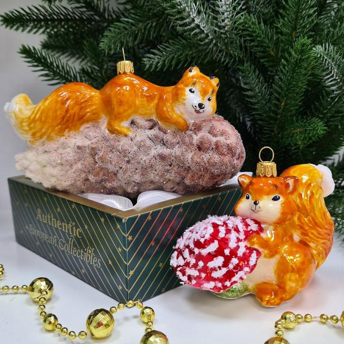 Набор елочных игрушек Белочка на шишке и белка с грибом рыжие