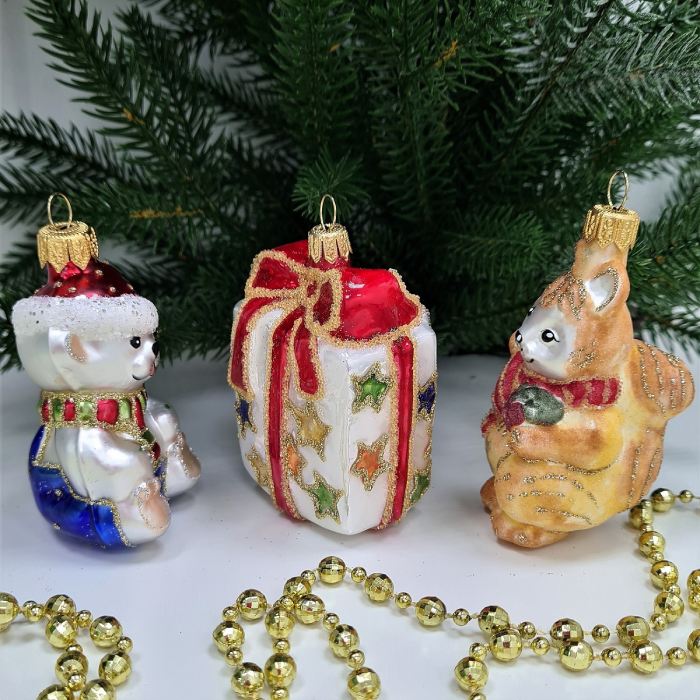 Набор елочных игрушек Белочка с орехом, мишка и подарок