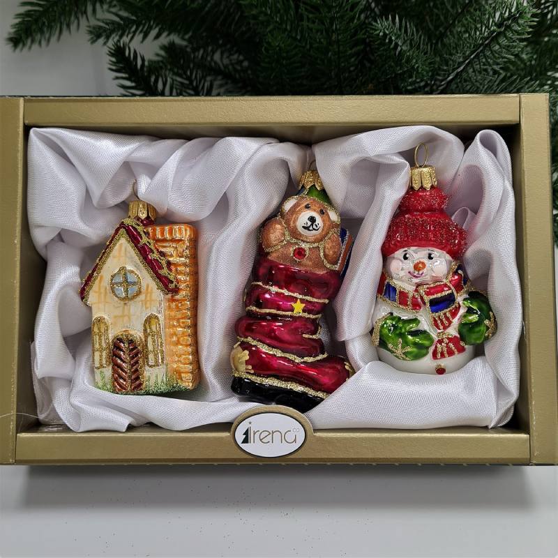 Набор стеклянных ёлочных игрушек Irena-Co «Ботинок с подарками» — это поистине уникальное украшение для вашей новогодней ёлки. В его состав входят три восхитительные игрушки: снеговик, домик и башмак с подарками.