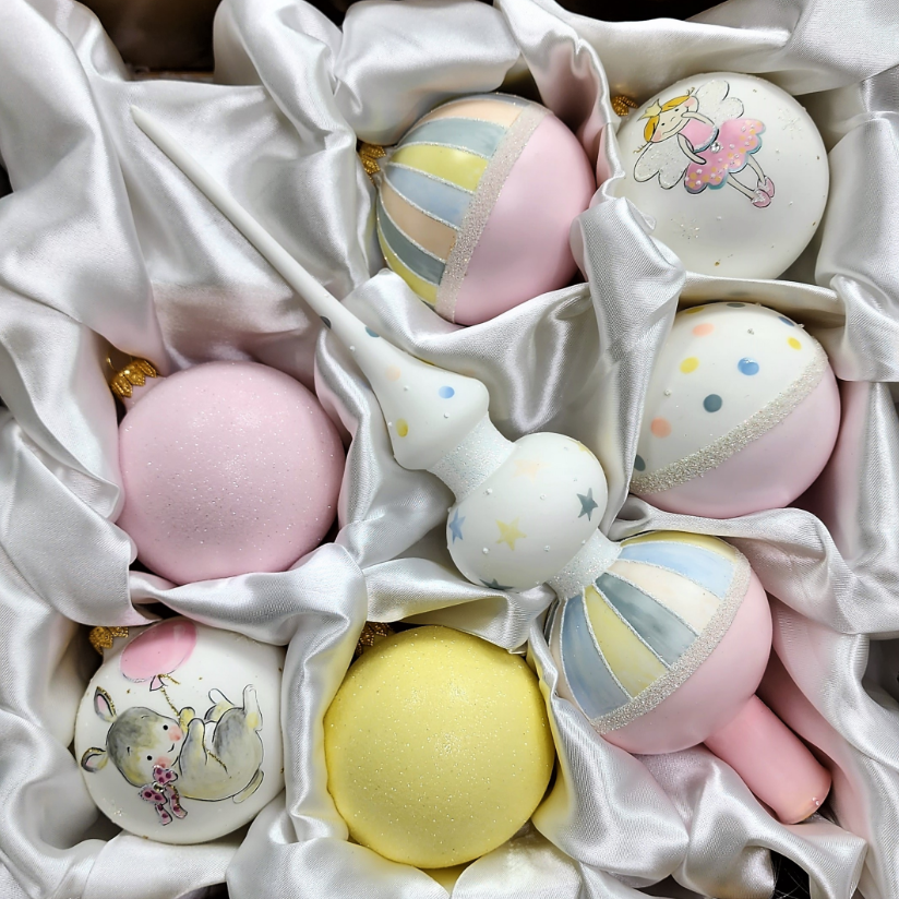 В комплекте вы найдете 7 стеклянных ёлочных игрушек, включая макушку.