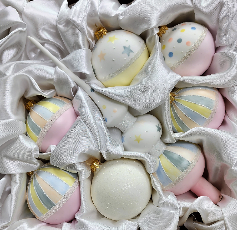 Игрушки изготовлены из стекла, что придает им особую прозрачность и блеск. Ручная роспись добавляет уникальности каждому изделию, делая их неповторимыми.