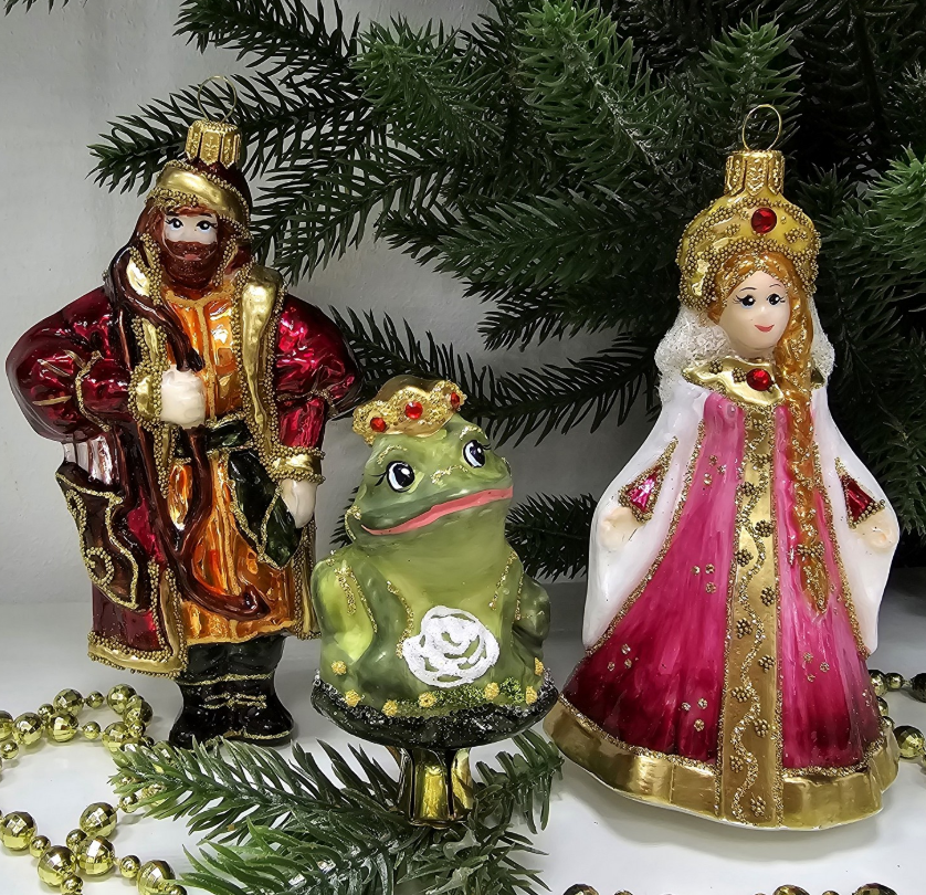 Набор стеклянных елочных игрушек Irena-Co "Царевна - 13х7х6, Царевич - 13,5х8х4, Лягушка - 8х4х5" - это уникальное украшение для вашей елки, созданное с любовью и вниманием к деталям. В комплект входят три игрушки: Царевна, Царевич и Лягушка.