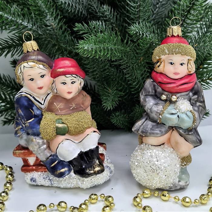 Набор елочных игрушек Дети на санях и девочка со снежком винтаж