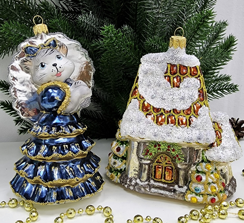 Набор стеклянных ёлочных игрушек Irena-Co Дом - 13х12,5х8,5, Кошка - 15х9х8,5