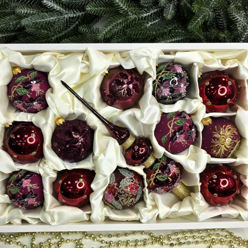 Каждая игрушка в наборе тщательно обработана и расписана вручную, что делает их уникальными произведениями искусства. Разноцветные стеклянные фигурки с новогодним принтом "Фуксия-1" красиво отражают свет и создают атмосферу праздника.