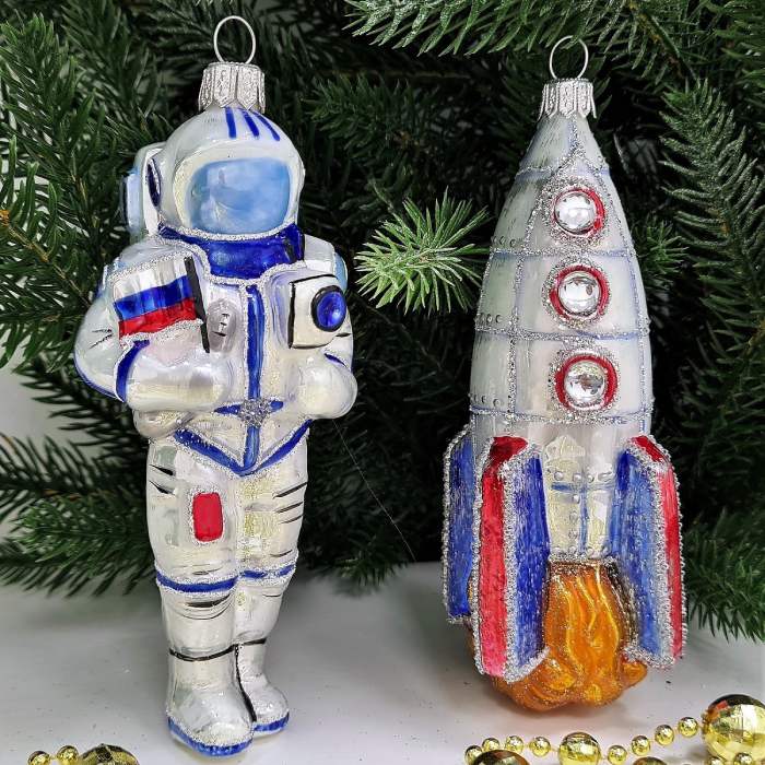 Набор стеклянных ёлочных игрушек "Космонавт" и "Ракета" станет отличным дополнением к праздничной атмосфере. Игрушки выполнены из стекла и расписаны вручную, что придает им неповторимый вид и делает каждую из них уникальной.