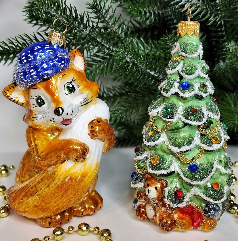 В комплекте вы получаете две стеклянные ёлочные игрушки: лису и елку. Лиса - 11,5х6,5х6,5см