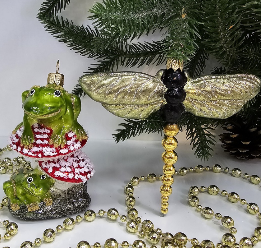 Набор ёлочных игрушек Лягушки на мухоморах и стрекоза