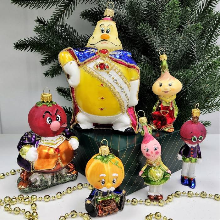 В наборе представлены фигурки мальчика-луковки Чиполлино и его друзей, что позволяет создать на елке сказочную атмосферу. Каждая игрушка имеет свой уникальный вес (450 грамм), что делает их устойчивыми и легкими в обращении.