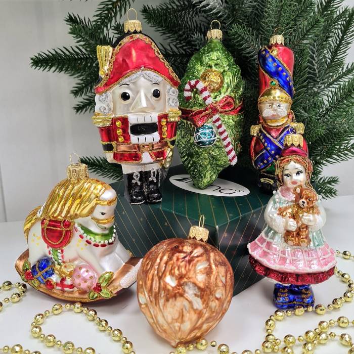 В наборе представлены разнообразные фигурки: Щелкунчик, Девочка, Солдат, Лошадка, Еловая ветвь и Орех.