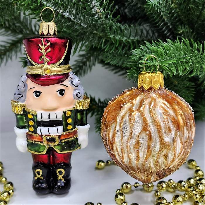 Набор стеклянных ёлочных игрушек Щелкунчик и Орех станет изысканным дополнением вашей новогодней елки и создаст атмосферу волшебства и тепла. Каждая игрушка изготовлена с особым вниманием к деталям и ручной росписью, что придаёт набору уникальный артистичный штрих.В комплект входят две великолепные игрушки: Щелкунчик размером 10,5х5,5х4 см и орех размером 6х5,5х5 см.