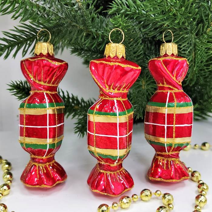 Набор стеклянных ёлочных игрушек "Три конфеты" прекрасныо дополнят ваш новогодний декор. В комплекте вы найдете три очаровательные игрушки, каждая из которых выполнена в форме конфеты и украшена ручной росписью.