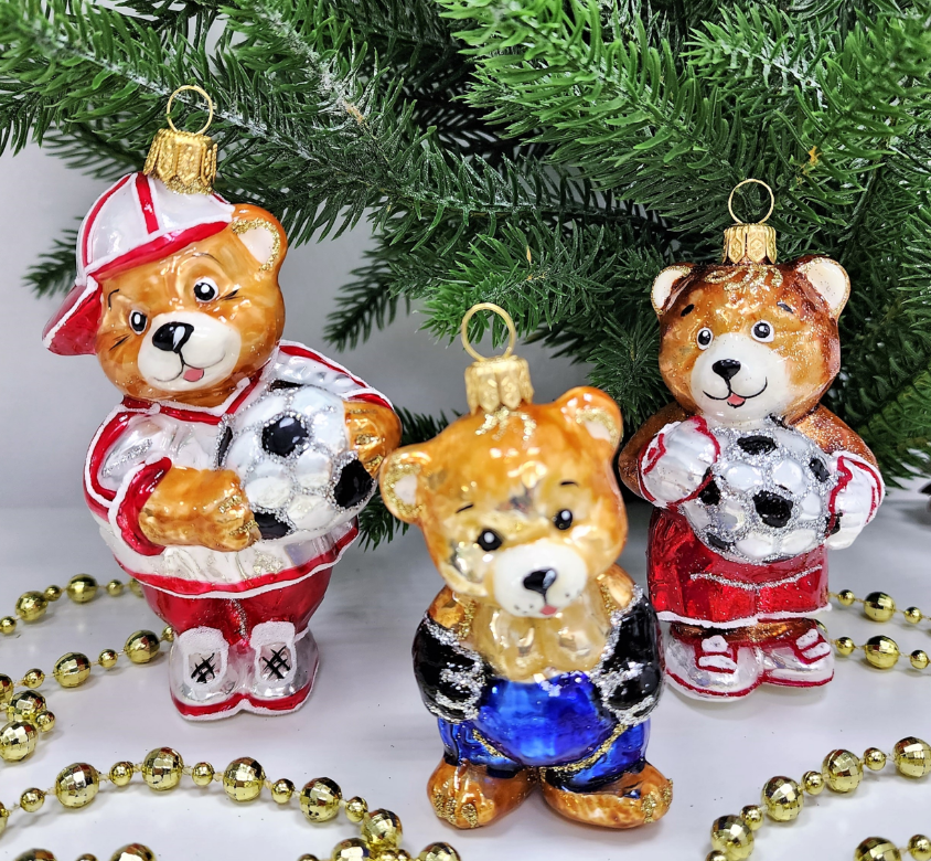 Набор стеклянных ёлочных игрушек Irena-Co "Мишка в кепке" - это уникальное украшение для вашей новогодней елки. В комплект входят три игрушки в виде мишек, которые одеты в разные спортивные костюмы: мишка с мячом, мишка в перчатках и мишка в кепке.