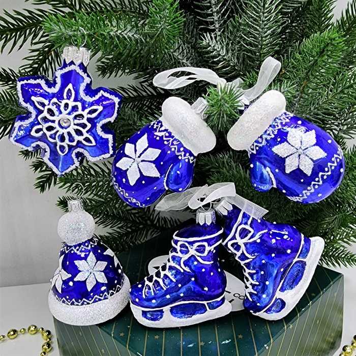 Игрушки имеют разнообразные формы и размеры, что позволяет создать действительно оригинальную и яркую елку. Коньки, шапочка, звезды и варежки - все это делает набор уникальным и неповторимым.