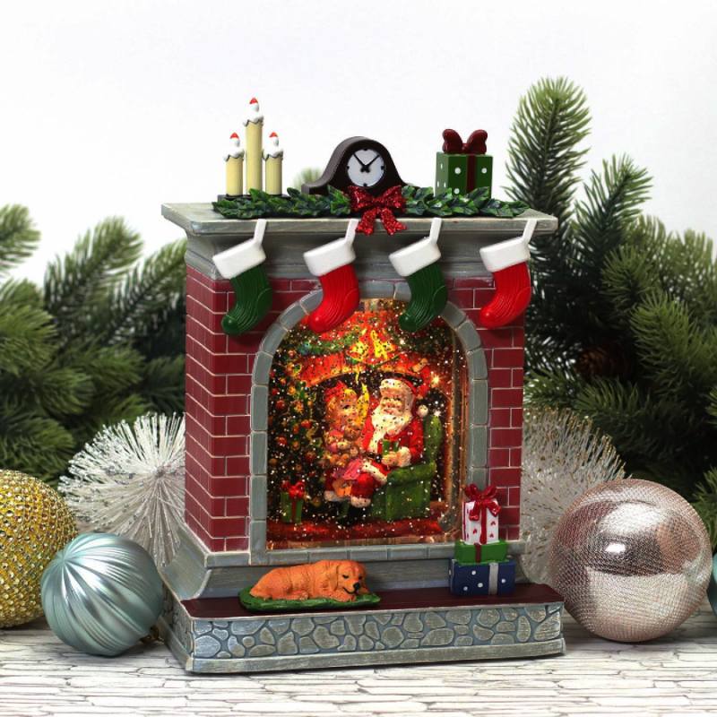 Новогодний музыкальный фонарик с подсветкой и снежным вихрем камин Дед Мороз и дети 26*18*10 см
