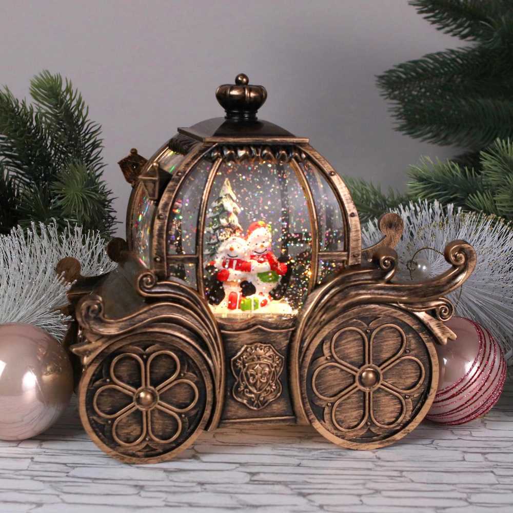 Новогодний музыкальный фонарик с подсветкой и снежным вихрем карета Снеговик 20*12*19 см (USB+бат)