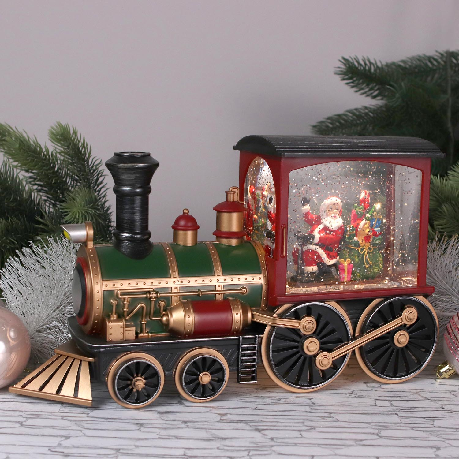 Новогодний музыкальный фонарик с подсветкой и снежным вихрем поезд Дед Мороз 32*10*17 см (USB+бат)