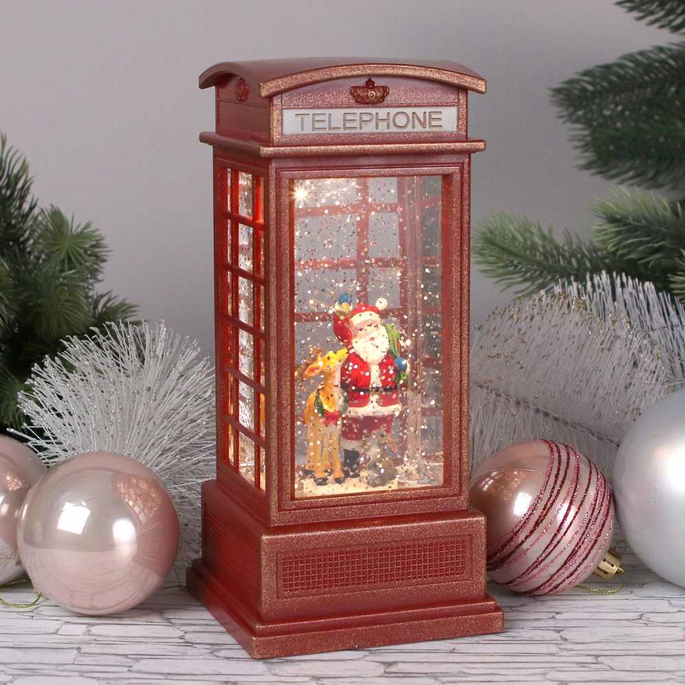 Новогодний музыкальный фонарик с подсветкой и снежным вихрем телефонная будка Дед Мороз 20*10*10 см