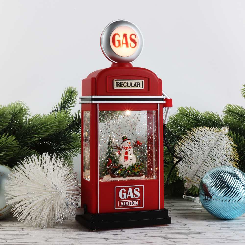 Новогодний музыкальный фонарик с подсветкой и снежным вихрем заправочная станция Снеговик 12*8*28 см