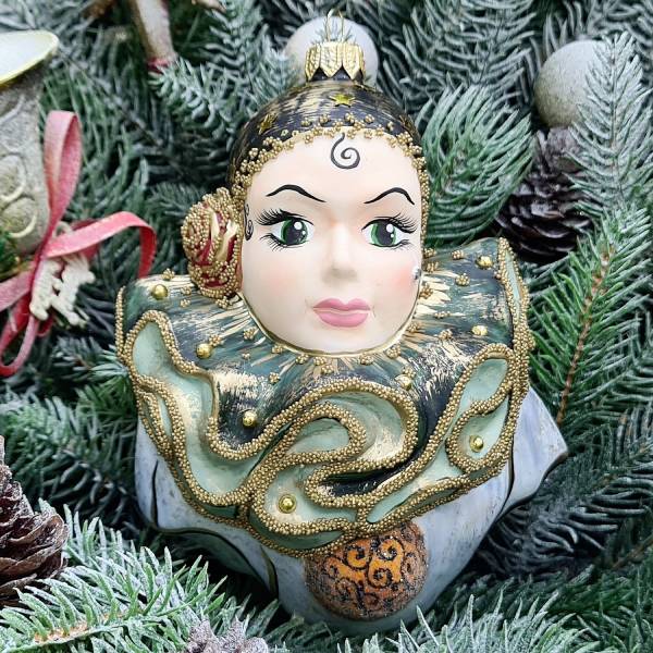 Стеклянная ёлочная игрушка «Арлекино» от Irena Co — изысканный символ Нового года, созданный вручную с особым вниманием к деталям. Её размеры 14х11х9,5 см, а вес 145 граммов. Каждая игрушка расписана с любовью и мастерством, что придаёт ей неповторимое очарование и уникальность.