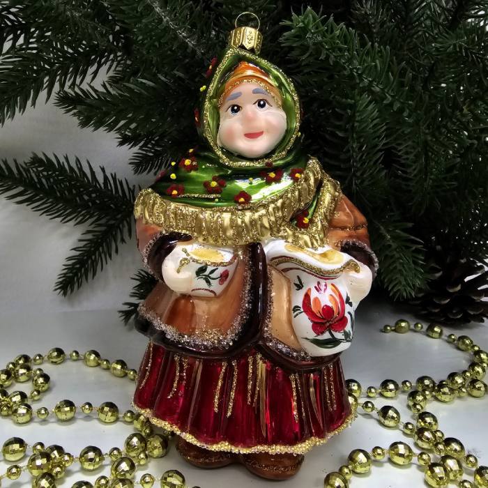 Стеклянная ёлочная игрушка "Бабушка с кувшином" - это уникальное авторское украшение, которое станет изюминкой вашего новогоднего декора. Ручная роспись и высококачественное стекло придают игрушке индивидуальность и долговечность.