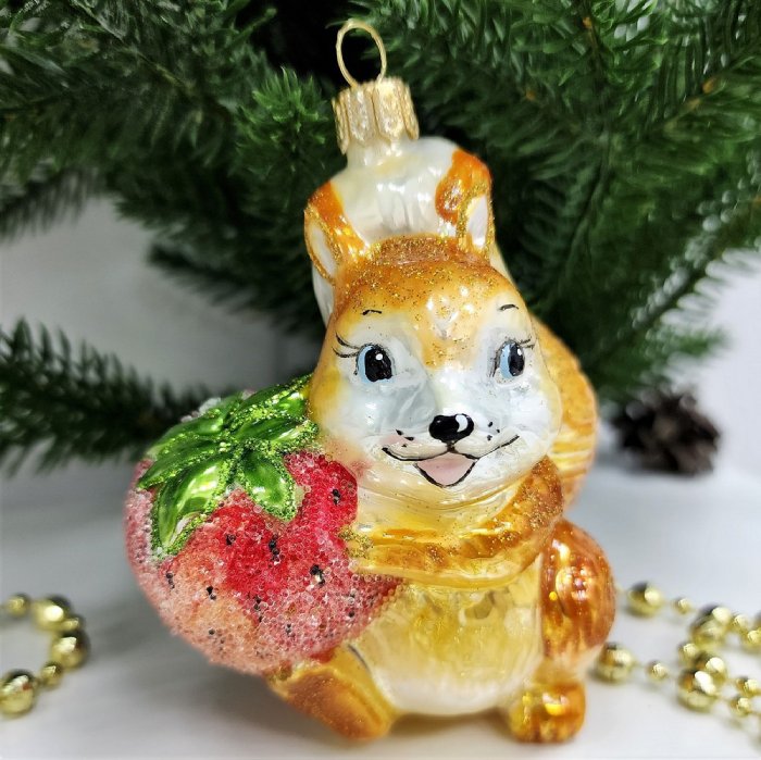 Стеклянная елочная игрушка Белочка с клубникой сахар