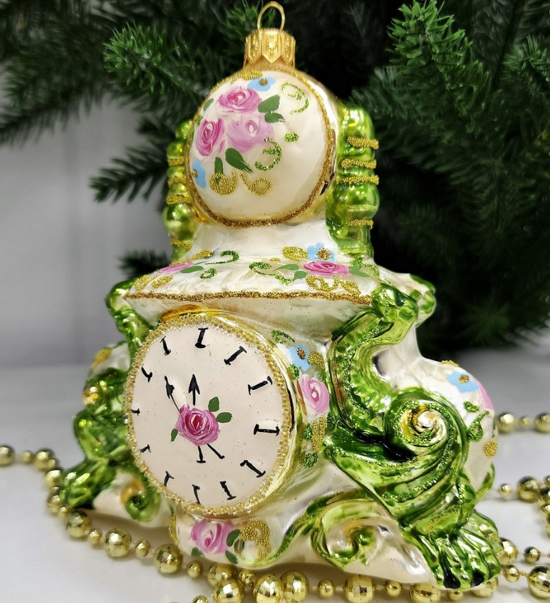 Дизайн игрушки выполнен в виде часов с глобусом, что придает ей особую уникальность и шарм. Нежные цветочные узоры и роскошная позолота на циферблате создают атмосферу праздника и волшебства. Фарфоровая белизна циферблата великолепно украсит новогоднюю ель и станет магическим символом каждого праздника.