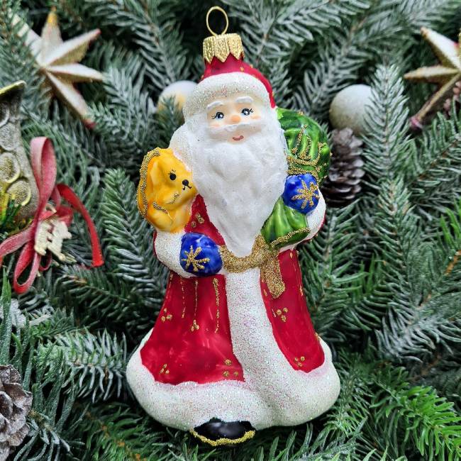 Стеклянная елочная игрушка Дед Мороз с белкой