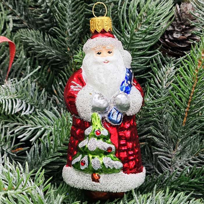 Стеклянная ёлочная игрушка Дед Мороз с елкой малый классическое новогоднее украшение, которое станет прекрасным дополнением к вашей елке.