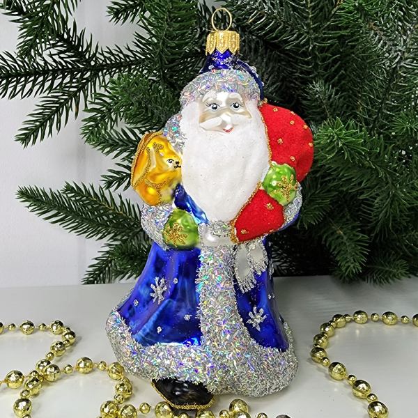 Стеклянная елочная игрушка Дед Мороз в синей шубе