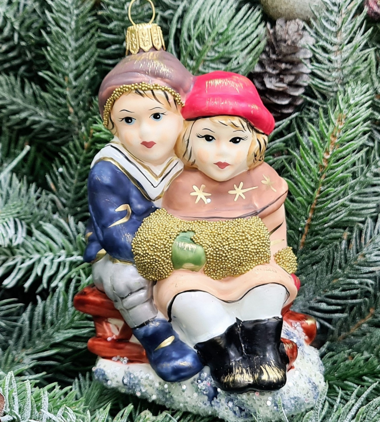 Игрушка выполнена в виде фигурки девочки и мальчика, которые едут на санях. Элементы муфты и меха в одежде персонажей украшены рельефными стразами, что придает игрушке особый шарм и винтажный стиль.