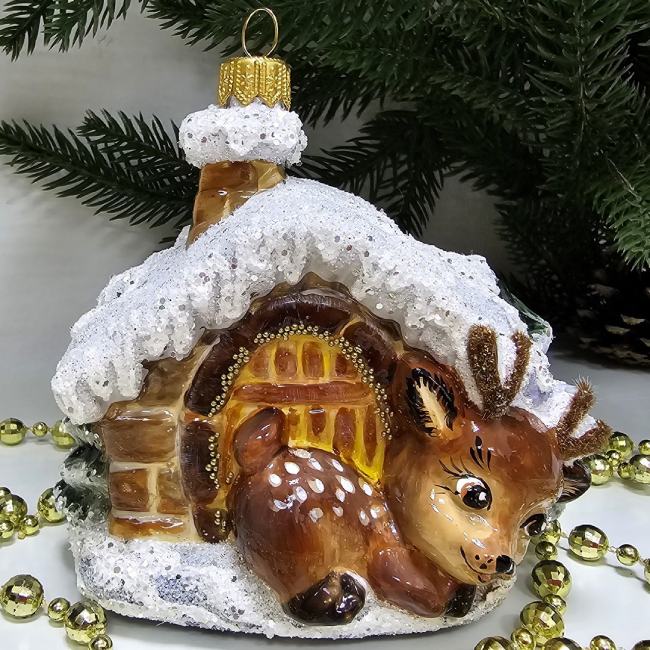 Стеклянная елочная игрушка Домик с олененком, арт. 1-1595