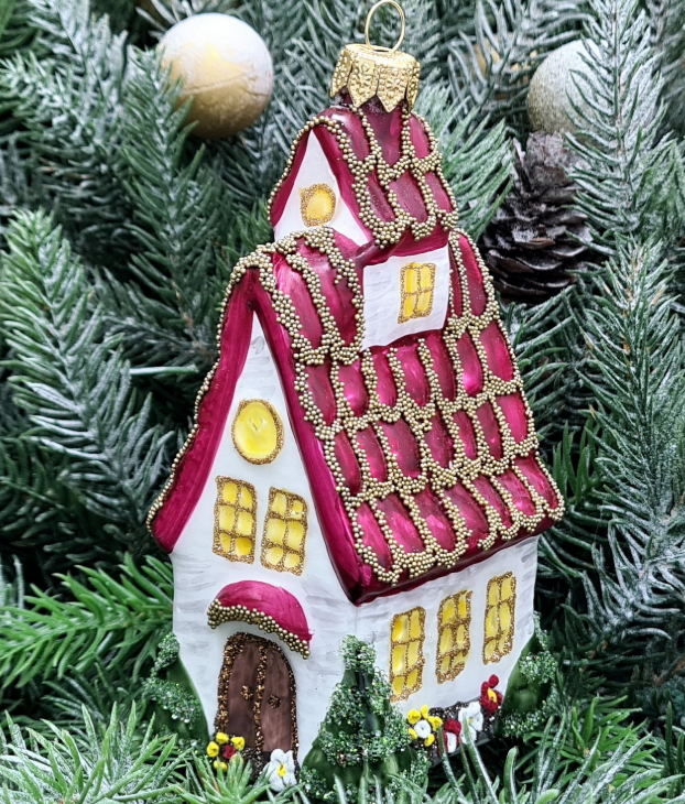 В комплекте идет одна стеклянная ёлочная игрушка "Домик с острой крышей винтаж".