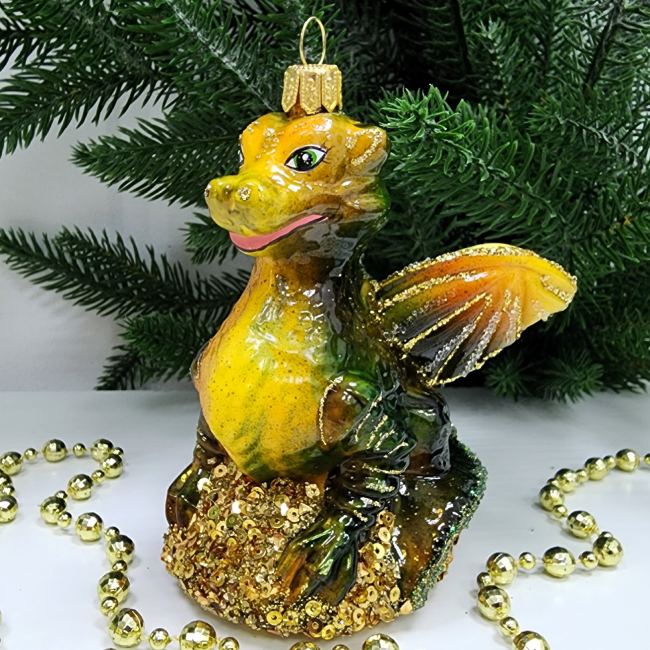 Стеклянная елочная игрушка Дракон на камне зеленый
