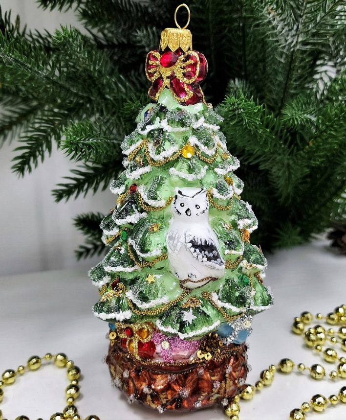Игрушка выполнена в виде елки, на которой сидит миниатюрная серебристая сова. На верхушке - красная звезда с блестками, что придает игрушке особый шарм. Ручная роспись добавляет уникальности и делает каждую игрушку неповторимой.