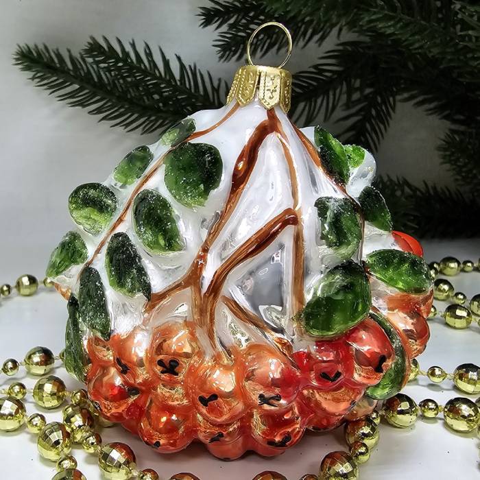 Размеры игрушки составляют 9х8х6 см, что позволяет разместить её на елке любого размера. В комплекте идет одна стеклянная ёлочная игрушка «Гроздь рябины».