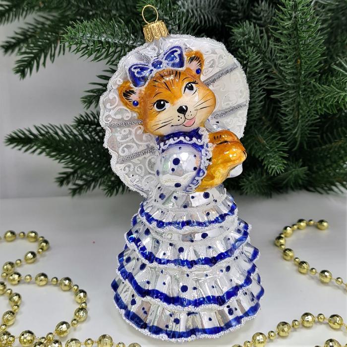 Стеклянная елочная игрушка Кошка с зонтиком голубая