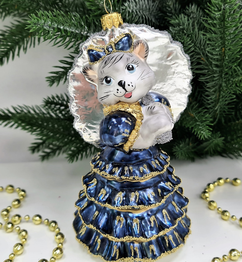Стеклянная елочная игрушка Кошка с зонтиком синяя