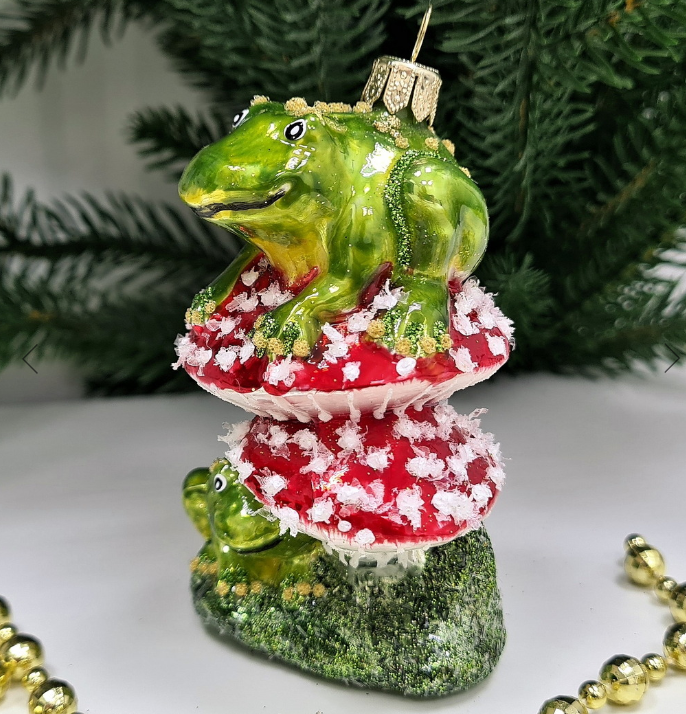 Стеклянная ёлочная игрушка "Лягушки на мухоморах" станет великолепным подарком для друзей и близких, и на долгие годы останется в вашей елочной коллекции. Не упустите возможность пополнить свою коллекцию эксклюзивными новогодними украшениями.